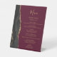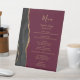 El borde izquierdo de este elegante y moderno menú boda muestra un borde de barra de acuarela negra recortado con un falso purpurina de oro. La palabra "Menú" aparece en un guión de escritura a mano de color dorado en un fondo de color burdeos. Personalice el texto restante con los nombres de la pareja, la fecha del boda y los detalles del menú.