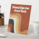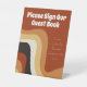 Esta seña peatonal de libro de bodas burdeos y retro presenta líneas onduladas en tonos marrones y naranjas, que recuerdan a los años 70 y al estilo de vida hippie. Decoración vintage audaz con un guión blanco funky junto a las líneas curvas abstractas. Groove junto con estos divertidos tonos de tierra. Por favor, firma nuestro libro de invitados.