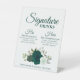 Este letrero de la mesa es perfecto para el bar en la recepción de tu boda. Presenta un diseño de moda boho sencillo pero elegante, con un conjunto de rosas acuáticos pintados a mano en tonos verde esmeralda y salvia. El cartel dice: Bebidas con firma, y hay espacio para su favorita y su favorita junto con los nombres de la pareja, la fecha de boda y las recetas de cócteles.