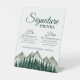 Este letrero de mesa es perfecto para el bar de la recepción de tu boda. Presenta un diseño sencillo con una acuarela rústica de pinos y montañas en tonos verdes del bosque. El cartel dice: Bebe firma, y hay espacio para su favorito y su favorito.