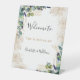 Bienvenidos a una boda elegante, un fondo blanco de moda. Decorada con hojas de eucalipto de color verde acuático, escarabajos, vegetación, hojas de oro falsas y manchas de purpurina dorada. Personalice y añada los nombres de la novia y del novio. Letras negras y doradas.