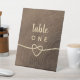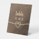 Elegante, sencillo, rústico boda de madera número de tablero signo con falso corazón de cuerda dorada y escritura moderna de caligrafía.
