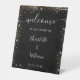 Una señal de bienvenida para un boda. Un elegante fondo negro decorado con finos destellos de purpurina dorado. Personalice y agregue sus nombres y la fecha de boda. Letras blancas.