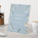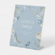 Romántico color de agua azul turquesa Floral Boda amor es dulce Rótulo de tabletop con celeste azul polvoriento y flores delfinísimas con eucalipto verde acentuado con mariposas. Añade el texto personalizado en un guión moderno y elegante. Diseñado por Evco Studio www.zazzle.com/store/evcostudio