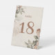 This elegant table number pedestal features a soft, neutral background with delicate botanical accents in muted earthy tones. Subtle watercolor-style florals and leafy greenery frame the design along the corners, creating a balanced and romantic look while leaving the center clean and easy to read. The table number is displayed in a warm terracotta-toned serif font that adds a touch of modern sophistication against the light textured backdrop. The overall style blends soft rustic charm with understated botanical elegance, making it a beautiful complement to garden weddings, boho celebrations, or refined nature-inspired event décor.