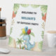 This 'one-a-saurus' design is suitable for a boy's 1st birthday party. The design includes blue and dark grey font, watercolour jungle elements and a blue dinosaur with party balloons.