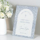 An arched blue and white religious design, recommended for boy's first communion, that combines the old and the new: a modern arch on a vintage blue and white floral pattern that resembles French toile de Jouy or chinoiserie. The name is written in script. The text is blue, inside the white arch. In the upper part of the blue arch, above most of the text there is a white cross and above the cross there is the arched welcome message.