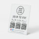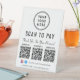 Simple señal de peatón de mesa para tu negocio con 3 o tus códigos QR vinculados a aplicaciones de pago para que los clientes puedan buscar pagos móviles sin contacto. Añade tu número de teléfono y sitio web en una tipografía simple. Añade tus instagram y tus datos de usuario de facebook para que los clientes te sigan en las redes sociales.
