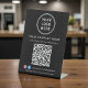 Upgrade your counter, reception desk, or checkout area with this custom QR code black pedestal sign, designed to help customers instantly connect with your business. Featuring a clean background, modern white lettering, and your logo, business name, and Facebook and Instagram social media handle, this professional tabletop sign fits seamlessly into retail stores, salons, studios, cafés, clinics, offices, and service-based businesses. With one quick scan, customers can view your services, pricing, menu, or website -- no typing required. Zazzle automatically generates the QR code from the website address you enter. The sturdy pedestal base keeps the sign upright and highly visible, while the minimalist design reinforces your brand and creates a polished, contactless experience. Perfect for promoting your website, encouraging social media follows, and streamlining customer communication, this personalized QR code sign is both functional and stylish.