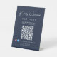 Chic dark blue pedestal tabletop sign for your business featuring your name in a stylish white signature script monogram and business type in simple white typography. Input your website address to create a QR code that customers and clients can scan for appointments, products, services, hours, etc. Add your instagram and facebook user ids for customers to follow you on social media.