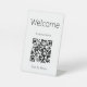 Bienvenido a los visitantes de su negocio con este cartel en blanco y negro. La bienvenida está por encima del texto que puede cambiar al nombre de su empresa. Además, puede introducir la dirección URL de su sitio web para crear un código QR personalizado. El texto adicional está cerca de la parte inferior que puede editar para crear un mensaje personalizado. (Se muestra: Buscar menú)