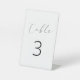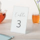 signo de pedestal del número de tabla de guiones de caligrafía fina minimalista en blanco y negro. Cambiar el color negro de la imagen gráfica "Table". Cambiar el color, el estilo de fuente, el tamaño de fuente o el espaciado de letras del número de tabla. Personalizar el fondo blanco para que coincida con la paleta de color boda.