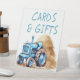 Señal de tarjetas y regalos con diseño de tractores agrícolas. Se sienta en la mesa de regalo en la fiesta de cumpleaños de un niño. El texto es azul con letras de sombras bronceadas. Un tractor azul se sienta frente a una pila de heno. La señal del puerperio viene en más tamaños y se parará por su cuenta.