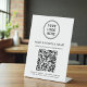 Señal de pedestal de mesa moderna para su negocio con su código QR para que los clientes puedan escanear para realizar un pago, para una lista de sus productos, servicios y precios, para citas, para registrarse, etc. Sube tu logotipo y código QR y agrega tu nombre de negocio, número de teléfono, dirección de calle u otra información en una tipografía simple. Desbloquee el potencial para un mayor compromiso con los clientes y elimine la brecha entre las experiencias offline y online, permitiendo que su negocio prospere en la era digital.