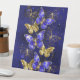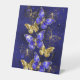 Composición de lujosas mariposas de zafiro y joyas de oro sobre fondo de textura azul.