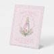Un conejo rosa lindo en la mesa de conejos encima de la señal peatonal para mostrar en su mesa de ducha de bebé al juego Besos Bebés. Un suave fondo rosa de gingham pastel. Conejo conejo conejo en un marco de cinta rosada con tulipanes de acento. Tan dulce como puede ser para un juego de ducha de bebé y este pedestal agrega otra pieza decorativa de festividad a cualquier mesa de evento.