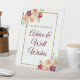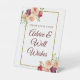Consejos de boda elegantes de color burdeos floral y letrero de buenos deseos con un hermoso ramo de flores de peonía de color melocotón acuarela que decora el preci