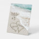 Corazones en la arena con olas del océano para números de mesa. Los nombres y el número de mesa son editables.