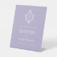 Un letrero de bienvenida de bautizo de lavanda y blanco.