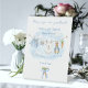 The Sign Our Guestbook Pedestal Sign features a sweet watercolor clothesline strung across the center, proudly displaying tiny, adorable items, each featuring a cute bunny dressed in blue. The scene is completed with a darling blue bow holding a bunch of fresh carrots, and bright, all rendered in a soft watercolor style. Easily add your own details and change the font style, size color and placement if you would like to.