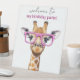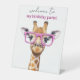 Make your celebration extra special with this adorable personalized pedestal sign featuring a stylish giraffe in pink glasses!