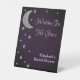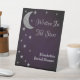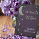 Desayuno nupcial escrito en las estrellas. Luna plateada y estrellas contra un fondo púrpura oscuro de medianoche