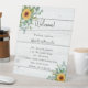 Un programa de bodas moderno, elegante, cronología. Madera rústica blanca como fondo. Decorado con girasoles, vegetación de eucalipto de color verde agua. Personalice y agregue sus nombres y detalles del boda. Letras de color negro. Si tienes más texto es posible reducir el espacio de línea.