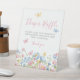 Animar a los huéspedes a participar en la rifa de pañales con esta encantadora señal de caída de Diaper Raffle. El "Diaper Raffle" se muestra elegantemente en la parte superior con un tipografía de escritura rosa suave, con un clásico mensaje serif gris debajo, que guía a los invitados a dejar sus pañales y tarjetas de entrada de rifa en el lugar designado. En el fondo del cartel se ve un delicado jardín de flores silvestres acuáticas con flores rosadas, azules, amarillas y verdes, acentuadas por mariposas dispersas para un toque caprichoso. Diseñado para combinar a la perfección con la temática A Little Wildflower Is On The Way, este letrero añade un toque elegante y organizado a la ducha de bebé. El texto, las fuentes y los colores se pueden personalizar para que coincidan con el evento.