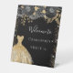Un cartel de bienvenida para una fiesta de cumpleaños dulce 16 y 16. Un fondo negro con un polvo falso purpurina de oro, un vestido dorado y rosas negros, florales. Personalice y agregue un nombre.
