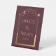 Celestial Red Gold Nacimiento Sun Moon Stars Astronomía Espacio Fiesta Evento Rótulo Pedestal Tabletop Rótulo con sol dorado, luna y estrellas con un marco dorado sobre un fondo rosado profundo. Adentro está tu texto personalizado. Diseñado por Evco Studio www.zazzle.com/store/evcostudio