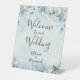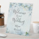 Un cartel de Bienvenida a nuestro Boda con un elegante, moderno y sincero guión escrito a mano que parece que usted mismo escribió el cartel, con un polvoriento fondo azul cielo de color azul acuático de flores, cuerdas y hojas pintadas de color azul polvoriento.