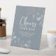 Elegante, vintage, floral y polvoriento boda azul Open Bar símbolo de pedestal con encaje periwinkle de flores silvestres y escritura moderna de caligrafía. Alegres - Bar abierto!
