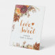 Eleva tu celebración de otoño con este Rótulo peatonal "Love is Sweet, Please Take a Treat", perfecto para añadir un toque de elegancia rústica a tu evento. Con una paleta cálida de naranja quemado, burdeos, rojo pálido, terracota y marrón, este cartel complementa cualquier decoración otoñal. Ideal para bodas, duchas de novias o cualquier reunión de otoño, guía a los huéspedes a sus reflexivos favores mientras realza el ambiente de temporada.