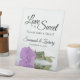 Este cartel de bonito es perfecto para una mesa de invitados en la recepción de tu boda. Presenta un diseño sencillo y elegante con una foto de un solo rosa de color lila morado de tallo largo reflejando en un estanque de agua con olas y ondas. El cartel dice: ¡El amor es dulce, por favor tómate un regalo! Hay sitio para sus nombres y la fecha del boda a continuación.