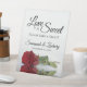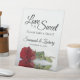 Este letrero de la mesa de bonito es perfecto para sentarse en una mesa de invitados en la recepción. Presenta un diseño sencillo pero elegante con una foto de una sola rosa roja de tallo largo que refleja un estanque de agua con olas y ondas. El cartel dice: ¡El amor es dulce, por favor tómate un regalo! Hay sitio para sus nombres y la fecha del boda a continuación.