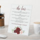 Este letrero de mesa es una buena forma de hacer saber a los clientes el menú del bar en la recepción de tu boda. Su diseño es sencillo y elegante, con un conjunto de rosas acuáticos pintados a mano en tonos burdeos, rojos y rosas. El título está escrito en una elegante caligrafía de escritura y dice: The Bar. Hay espacio para tu carta de bebidas, así como para los nombres de la pareja y de la cita boda.