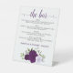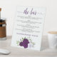Este letrero de mesa es una buena forma de hacer saber a los clientes el menú del bar en la recepción de tu boda. Presenta un diseño sencillo pero elegante con un conjunto de rosas acuáticos pintados a mano en tonos violeta, lavanda y ciruela. El título está escrito en una elegante caligrafía de escritura y dice: The Bar. Hay espacio para tu carta de bebidas, así como para los nombres de la pareja y de la cita boda.