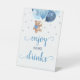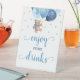 Watercolor Teddy Bear Balón Azul y Plata Toma Algunas Bebidas Bar Mesa Rótulo Baby Shower. El diseño presenta un elegante diseño de texto de estilo moderno. Para realizar cambios avanzados, seleccione la opción "Hacer clic en el personalizar más adelante".