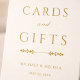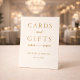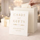 This elegant ivory and gold Cards and Gifts sign adds a refined touch to your wedding or anniversary reception. The classic serif lettering paired with delicate gold botanical accents creates a warm and welcoming display for your gift table. Designed to coordinate beautifully with timeless ivory and gold décor, it is perfect for weddings, vow renewals, and milestone anniversary celebrations. A sophisticated finishing detail for hotel ballroom or formal reception settings.