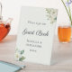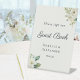 Encourage your wedding guests to write a note in your guest book, with this elegant pedestal sign. With white floral motifs and lush greenery in a watercolor style, this tabletop sign complements a classic, romantic, or garden-themed wedding. The clean serif typography and graceful script provide a high-end look that is fully customizable with your names and wedding date.