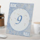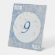 El diseño presenta un elegante efecto "marbling" de tonos azules y grises como fondo de la forma que muestra el número de la tabla claramente en azul. La apariencia de las cintas delicadas junto con la caída del arroz superponen el diseño. El monograma de la pareja se muestra en la parte inferior derecha. La palabra "Tabla" se muestra en la parte superior izquierda. Muy Elegante. Diseñada para acompañar la "Suite Boda de Mármol Azul y Gris".