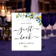 Un colorido y radiante cartel de libro de bodas con hermosas hojas de eucalipto y follaje botánico verde acuarela. Mejore su decoración boda con este elegante símbolo de pedestal boda amarillo, azul y blanco. Con un diseño sofisticado adornado con delicadas flores amarillas, suaves flores blancas y elegantes acentos azules, este signo desprende un encanto y un romanticismo intemporales. La tipografía refinada y los detalles de las acuarelas crean una estética fresca y elegante, lo que la convierte en el lugar perfecto para acoger a los huéspedes, mostrar los asientos o resaltar detalles importantes. Ideal para bodas de primavera y verano, celebraciones en el jardín o recintos rurales, este elegante cartel peatonal le da un toque de elegancia y sofisticación a su día especial.