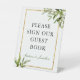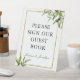 Este elegante cartel botánico verde del libro de visitas está enmarcado con hermosas hojas de acuarela verde y viñas de oliva y un marco rectangular de oro. Este bonito decorado de color verde y oscuro es perfecto para un evento otoñal de lujo para una novia elegante en otoño. Por favor, firma nuestro libro de invitados.