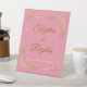 Elegante marco dorado rosado Quinceanera Cards & Gifts Rótulo Pedestal con un refinado diseño de marco dorado. Perfecto para un dulce quince, esta plantilla de personalizable puede ser personalizada en español o inglés para un toque atemporal y femenino.