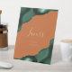 Una moda, un signo elegante para dar la bienvenida a los clientes bodas a su mesa. La palabra "favores" aparece en caligrafía de escritura a mano de color dorado, con la invitación "por favor tome una" debajo en letra serif. Los diseños de agate de color verde esmeralda recortados con purpurina falso dorado enmarcan el mensaje en dos esquinas sobre un naranja quemado o fondo de roya. Consulte nuestra colección para ver el paquete de invitación a la boda y la papelería del día.