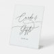 Esta elegante tarjeta boda con encanto y el signo de los regalos son perfectos para una simple ducha de boda o de novia. El moderno diseño minimalista presenta una caligrafía romántica blanca y negra intemporal con un estilo bohemio de cuento de hadas. La línea de texto en la parte inferior de la señal de esta mesa de regalo puede ser personalizada con la fecha, los nombres de la novia y el novio, o un mensaje corto como "Gracias". Este signo se puede usar para un boda, una ducha de bebé o cualquier evento o fiesta.