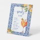 Esta invitación para una fiesta de despedida de soltera presenta un tema de color azul brillante con cítricos.
