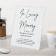 En la memoria amorosa boda la señal de la tabla conmemorativa con espacio para personalizar el texto y agregar los nombres. En el ejemplo se lee "de esos para siempre en nuestros corazones hoy y siempre". Diseño de caligrafía blanca y sencilla para la recepción o la ceremonia. Una gran decoración de recuerdo que se puede personalizar con los nombres de la novia y del novio en la parte inferior.