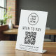 Simple cartel de pedestal moderno para mesa para su negocio con un código QR para que los clientes lo escaneen para realizar pagos. Agregue su logotipo, nombre comercial, código QR, número de teléfono y dirección en tipografía simple.