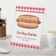 Diseñado para los fiestas que tienen un bar de perritos calientes DIY / estación de hot dog que permite a los huéspedes construir su propio hot dog con los rellenos y toques que les gustan. El diseño incluye el ilustracion de comida rápida de Destei de un panecillo de perritos calientes con una salchicha a la parrilla que tiene un poco de ketchup y mostaza encima. El color de fondo principal es blanco, mientras que el de arriba y el de abajo tienen un color de gingham rojo. También hay dos áreas de texto personalizables con fuente de color rojo.
